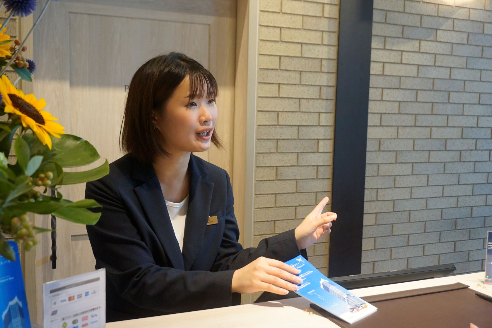 香港出身で、就職のために日本へ移住した何 琬晴(カ ワンセイ)さん。昨年9月にフロントスタッフとして入社し、今回訪れた際もフロントで業務をこなしつつ、明るい笑顔で出迎えてくれました。