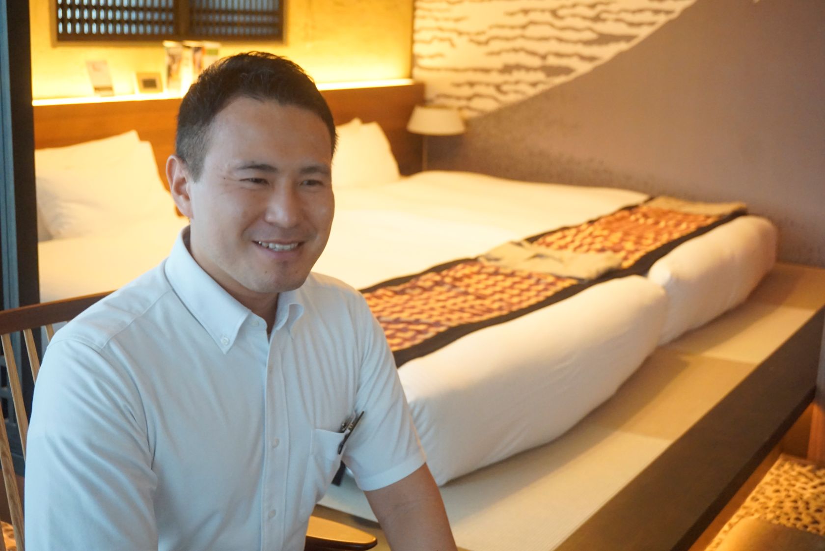 続いてお話を伺ったのは、 マネージャー荒木翔太さん。2017年8月に入社し、他の系列施設で2年間フロント勤務を経験の後、このホテルのオープニングスタッフとして異動されました。4年ほどフロント経験を積み、現在は客室の在庫・料金調整を担当されています。